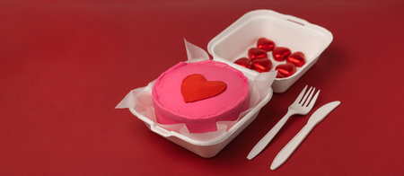 Plastic lunch box with heart-shaped bento cake on red background, closeup. Valentine's Day celebration