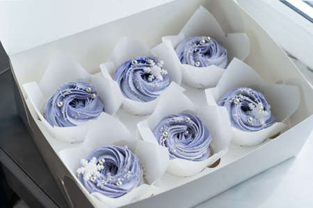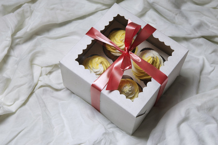 delivery box with delicious freshly baked homemade lemon muffins cupcakes with butter cream for present , copy space