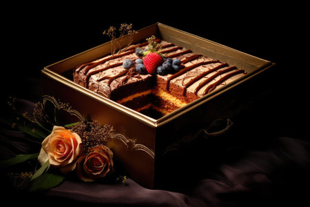 Cake in a box on a black background. Selective focus.