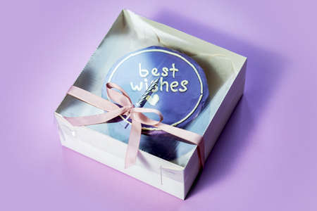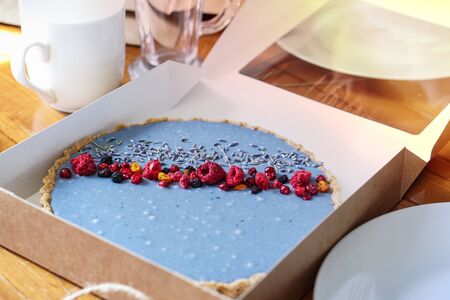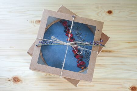 Homemade cake with freeze-dried berries packed in an eco box. Lavender flowers decor. Photo