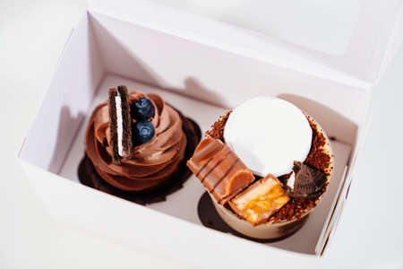 dessert in a glass and chocolate cupcake with cream in box on white background.