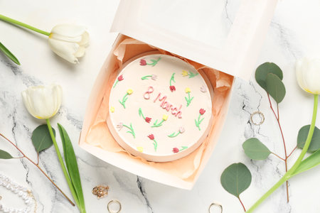 Box with sweet bento cake, beautiful tulips and rings on white background. International Women's Day