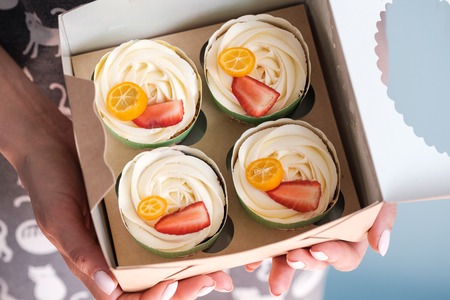 A bunch of cakes are in the hands of a woman. Strawberries, kumquat and whipped cream. Craft packaging.