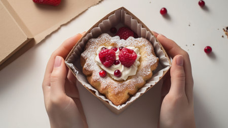 a close up of a person holding a pastry with raspberries and cream in a box on a pink background. .