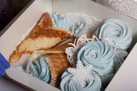 Homemade marshmallow in a gift box. Nearby is a zephyr in a waffle cone. Close-up shot.