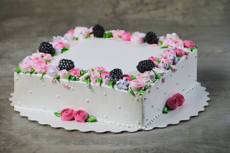 Biscuit large cake with cream roses and written congratulations. Sweet cake with creamy flowers, sprinkled with gold beads and lettering