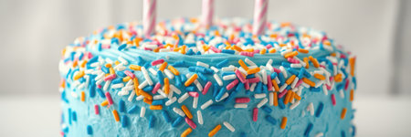 Blue buttercream cake with colorful sprinkles over a light grey background.