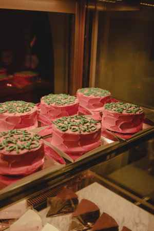 Many beautiful delicious pink cakes topped with green cream for sale at a bakery
