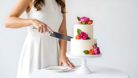 Cropped shot of woman cutting delicious cake on white background. Wedding layer cake on a wooden stand.