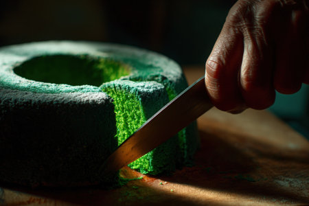 Close-up view of pandan chiffon cake being sliced with a knife, revealing its fluffy texture and rich green color, emphasizing the art of baking and presentation