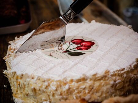 Woman's hands cut the cake with cream on wood background. Woman holding piece of cake on shovel over big cake on stand.