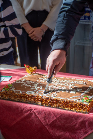 Man cutting traditional Greek New Year cake Vasilopita with white icing, festive celebration event with people standing in background