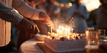 Cutting a birthday cake with candles at an outdoor party during sunset