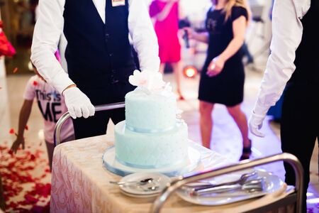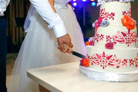 Wedding cake. The bride and groom cut the cake at the Banquet