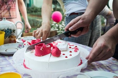 Hands of the bride and groom. Take a piece of wedding white cake spatula