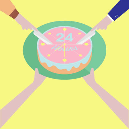 People divide the 24 hours cake which hand on by someone imply how we manage time. Time management concept. Vector Illustration.