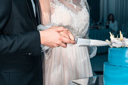 The bride and groom cut a huge, beautiful cake, a wedding tradition, a wedding couple holds one knife together and cuts a cake, happy and loving people, a party in a restaurant