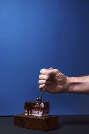 a man's fist aggressively squeezes a fork and violently plunges into the cake, as a symbol of home comfort and care. conceptual photography that draws attention to the problems of domestic violence.
