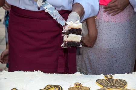 Confectioner cuts a cake. Man holding a piece of cake on a knife.
