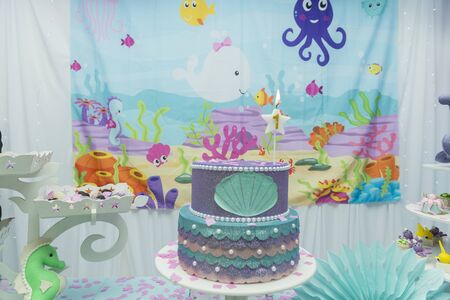 Cake table overview decorated with the seabed theme. Children's party with octopus, seahorse, oysters, corals and colorful balloons. Party and fun concept.