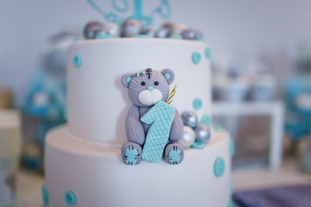 Izmail, Ukraine - July 2019. Birthday cake for a one year old boy. Teddy bear cartoon character shape and blue decorations of mastic.