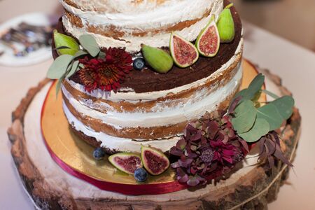 Delicious chocolate cake with figs and berries. Wedding Naked cake with fruits in rustic style.