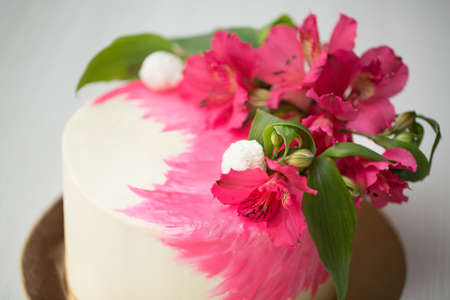 Cake with chocolate, decorated with strawberries, jasmine flowers and honeysuckle on white wooden table on big plate