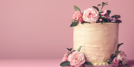 Pink floral cake on pink background decorated with roses. Perfect for wedding, birthday, or special occasion celebration. Copy space.