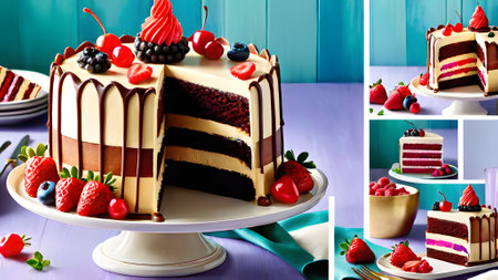 Vibrant close-up of a slice of cake, elaborately decorated with fresh berries, resting on a soft pink background. The cake showcases layers of light-colored sponge cake with white frosting. The berries are arranged artfully, creating a visually appealing display.