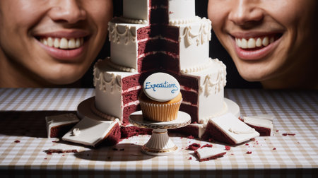 Crumbling wedding cake reveals cupcake with expectations written on it