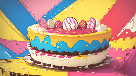 Brightly coloured birthday cake with frosting and iced decorations on a cake stand. Generative ai
