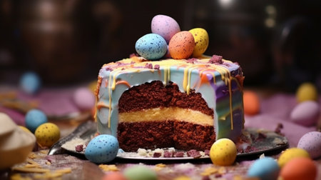 Easter cake with multicolored eggs on a colorful background. Top view.