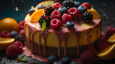 Delicious cake with fresh berries and fruits on dark background, closeup