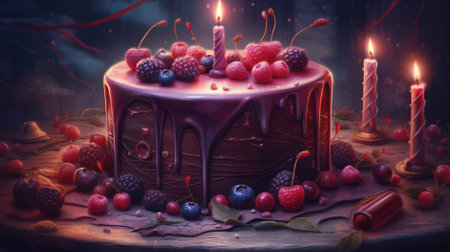 Birthday cake decorated with berries, candles and flowers on wooden table
