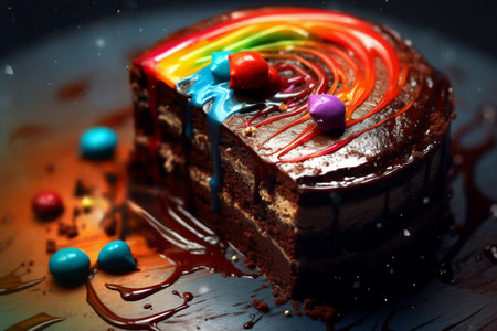 Piece of chocolate cake with rainbow icing and colorful candies on dark background,Generative AI.