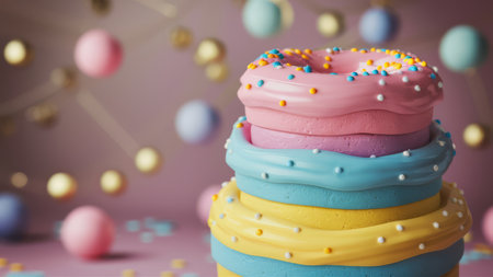 Elegant celebration cake with pastel icing and decorative sprinkles, with a festive background.