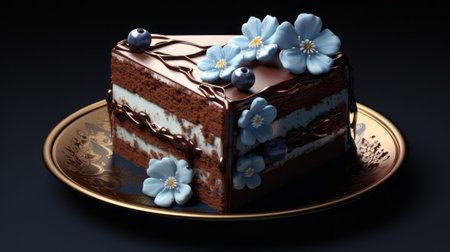 a chocolate and blue cake slice sits on a brown plate, showcasing photorealistic fantasies. this 8k 3d creation, rendered with vray, features delicate flora depictions. the highly realistic and finely rendered textures make it hard to believe how beautiful this cake slice looks. ai generated