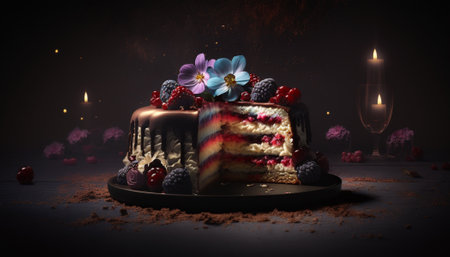 Piece of cake with berries and florals on dark background