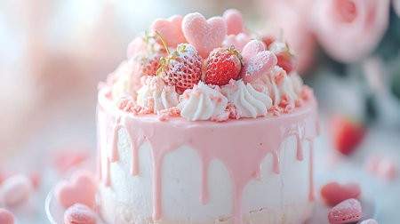 Strawberry ice-cream cake decorated with fresh strawberries and hearts