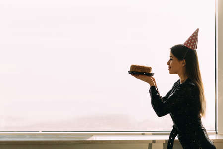 beautiful caucasian woman holding a cake looking at a candle, standing at the office window, light background, profile view of a girl with a birthday cake, birthday celebration concept, space for text