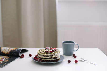 homemade cake with spinach and cream decorated with fresh cranberries on white table, diet breakfast