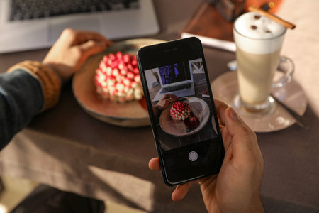 Hands of young female with smartphone taking photo of piece tasty cheesecake on saucer served with cappuccino in cafe