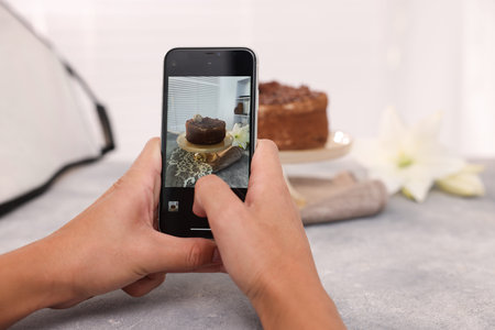 Man taking picture of chocolate cake in studio, selective focus. Professional food photography