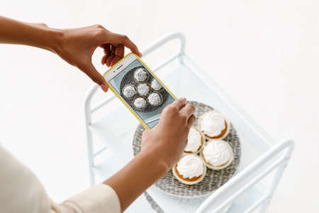 Girl's hands taking pictures of healthy oatmeal cupcakes by phone, top view. Selective focus