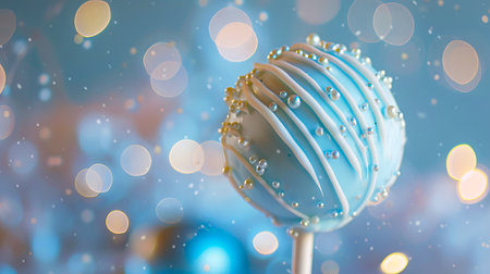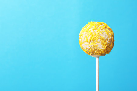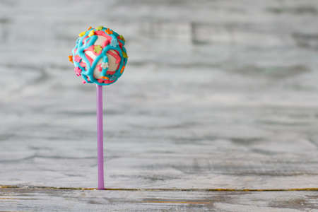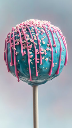 Cake pop with blue icing and pink sprinkles, close-up view. Sweet dessert and confectionery concept