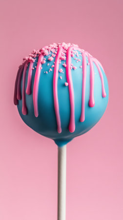 A vibrant pink cake pop covered in icing and decorated with colorful sprinkles. The dessert stands out against a soft, pastel background, evoking feelings of fun, celebration, and sweetness.