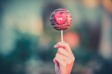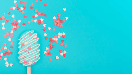 Pops cake on a stick with a sprinkle of hearts on a pink background. High quality photo