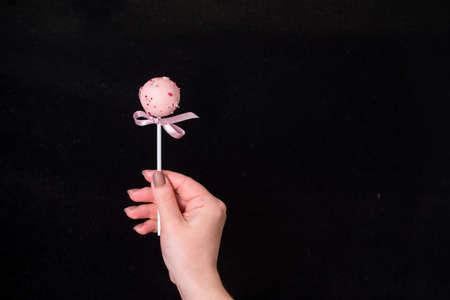 Cake pops in women's hands on a black background. Dessert in pink chocolate cream with powder and bow. Tasty food