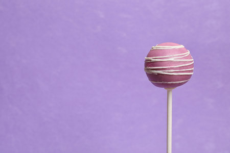 Delicious confectionery. Sweet cake pop and sprinkles on purple background, flat lay. Space for text