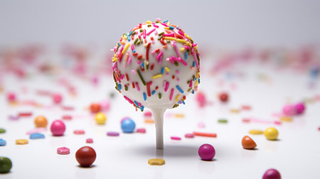 A photo of a candy-covered cake pop on a white surface, showcasing the delicious and whimsical treat